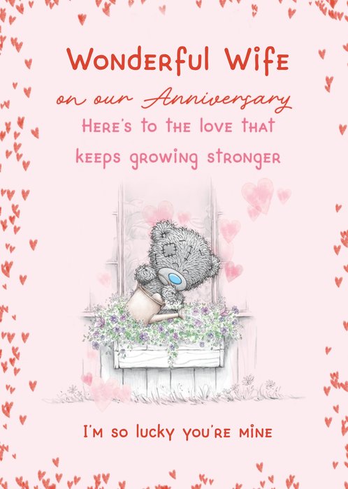 Featuring an illustration of Tatty Teddy watering a window box full of flowers with hand-lettered red & pink text on a pink background, with heart illustrations around the edge of the card.