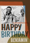 Front of card: Featuring a large photo upload area, surrounded by screenprint effect blocks of colour, with text below, on a textured paper background.