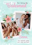 Front of card: Features a two large photo uploads with decorated floral illustrations with text above and below. Text reads: "Thank you for being my bridesmaid Emma helped make our day perfect". 'Name can be personalised!