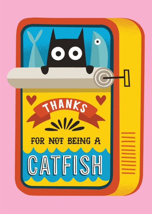 This greeting card design features a playful illustration of a colourful sardine tin with a black cat peeking out, surrounded by fish illustrations, set against a pink background. The humorous text “Thanks for not being a catfish” is displayed on the sardine tin in bold, stylised fonts with additional decorative elements like hearts and wavy patterns.