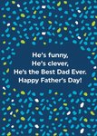 Front of card: The Best Dad Ever! Father's Day Card Humorous typography surrounded by colourful confetti on an blue background. Text reads: "He's funny, he's clever, he's the best dad ever. Happy Father's Day".