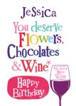 "You deserve flowers chocolates & wine* *& some more wine. Happy Birthday."