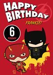 Features The Flash and Batman with text above them. They are drawn in a Kawaii cartoon style.