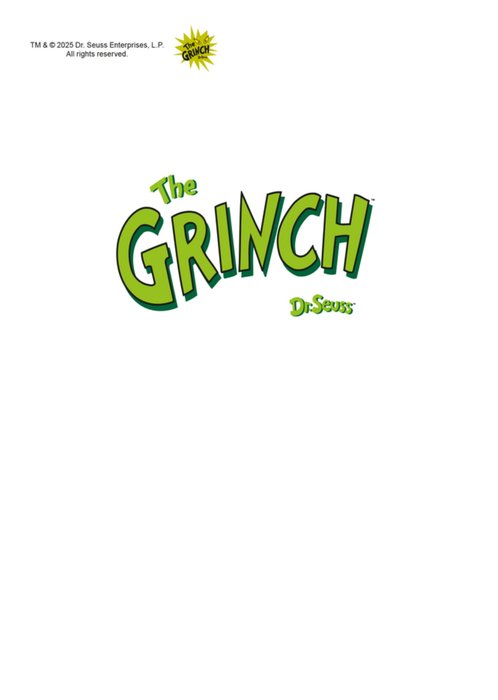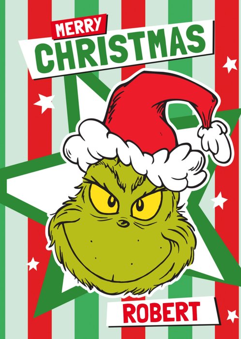 Featuring a cartoon illustration of the Grinch wearing a Santa hat with a mischievous grin and star accents, on a red, green and white coloured background.