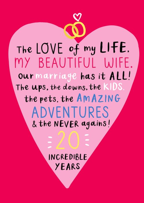 “The love of my life, my beautiful wife. Our marriage has it all! The ups, the downs, the kids, the pets, the amazing adventures & the never agains! 20 incredible years.” '20' can be personalised!