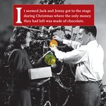 Front of card: Featuring a black and white photo of a couple decorating a Christmas tree with chocolate money. Text reads: "It seemed Jack and Jenny got to the stage during Christmas where the only money they had left was made of chocolate.". 'Jack and Jenny' can be personalised!