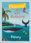 This cheerful The Snail And The Whale greeting card depicts a whale swimming in a tropical sea, surrounded by parrots, palm trees, and goldfish, with a playful birthday message on a bright blue background.