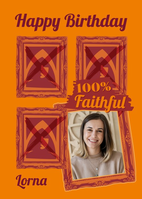 This The Traitors greeting card design features a bold orange background with four ornate picture frames, three of which are crossed out in red, symbolising eliminated contestants, and the fourth frame includes a rectangular photo upload area in the bottom right corner. The text “Happy Birthday” is displayed at the top, with “100% Faithful” placed prominently over the fourth frame, and the name “Lorna” appears at the bottom.