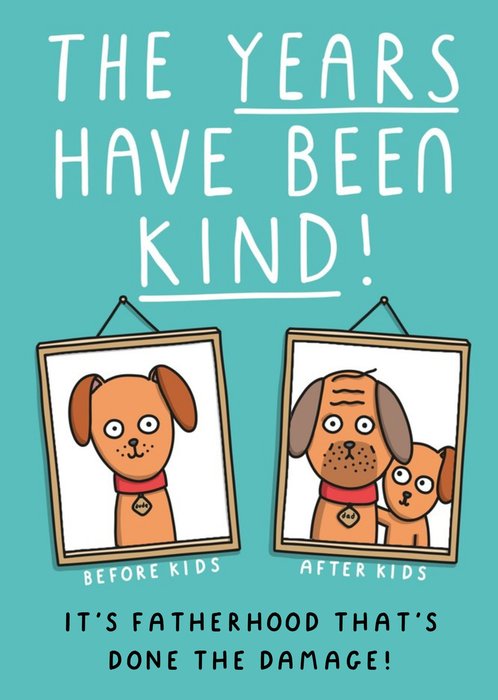 Front of card: The Years Have Been Kind! Father's Day Card Humorous illustration of before and after photos. Text reads: "The years have been kind! It's fatherhood that's done the damage!". 'It's fatherhood that's done the damage!' can be personalised!