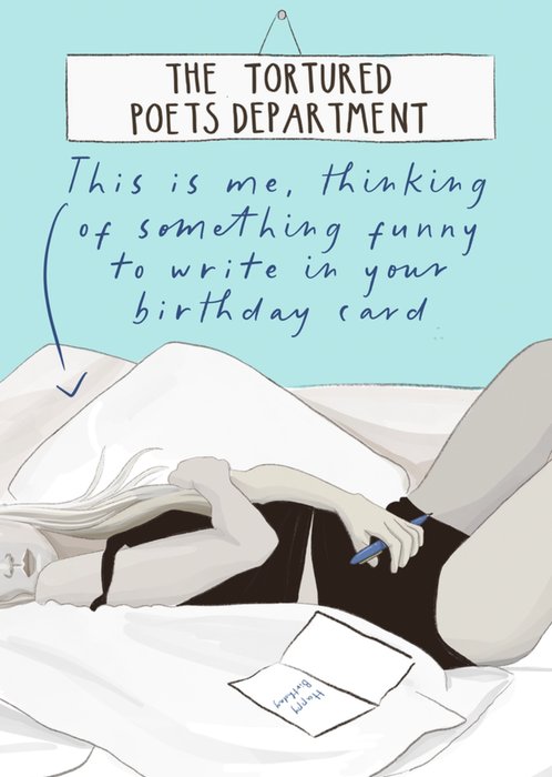 Front of card: Featuring an illustration of an American singer-songwriter writing in a birthday card. Text reads: "The tortured poets department this is me, thinking of something funny to write in your birthday card".