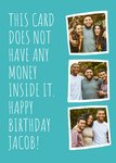 "This card doesn't have any money inside it! Happy birthday Jacob". All text can be personalised!