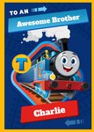 Features illustration of Thomas bursting out of a rounded diamond shape on a blue train track background Text reads: "To An Awesome Brother Charlie". Awesome Brother and Charlie are customisable.