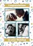 Front of card: On Your Wedding Day Photo Upload Card Three photo frames surrounded by colourful confetti. Text reads: "Congratulations on your wedding". All text can be personalised!