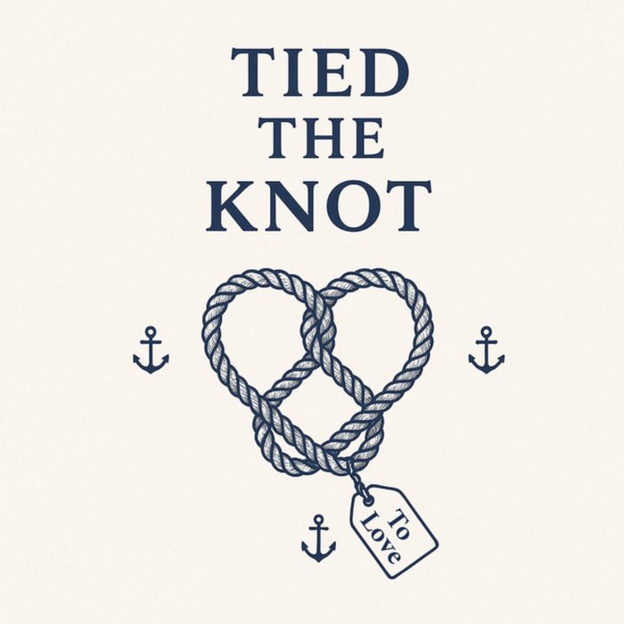Featuring bold navy typography above a rope illustration shaped into two interlocking hearts with small anchor icons on a soft cream background, this greeting card has a nautical wedding theme.