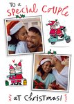 This festive greeting card design features two photographs of a couple, framed by playful illustrations of Santa Claus and holiday decorations, along with the text "To a Special Couple at Christmas!" conveying a warm and loving message for the holiday season. There are two photo upload areas in rectangular frames.