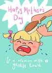 This humorous Mother’s Day card features an illustration of a child crying while having their hair brushed, playfully referencing a mum’s “gentle touch” with a mix of nostalgia and humour.