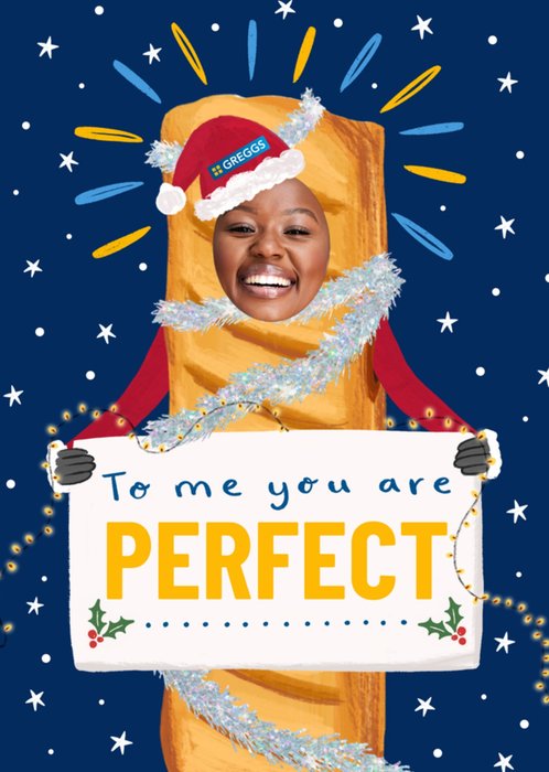 Featuring an illustrated festive scene with a large sausage roll character dressed in tinsel and a red Greggs Santa hat. A single photo upload frame appears where the character’s face would be. The character holds a sign decorated with holly, set against a dark blue background with stars and festive lights.