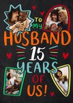 A black textured background is brought to life with bright, hand-lettered typography in orange, teal, red and white, dotted with doodle hearts and burst lines. Four quirky, irregular-shaped photo upload frames with colourful borders surround the message.