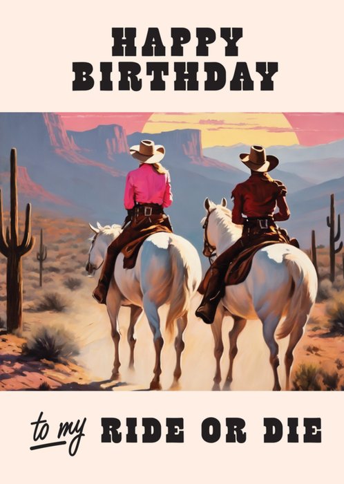 Front of card: Featuring two people riding white horses through a desert with a sunset in the distance. Text reads: "Happy birthday to my ride or die".