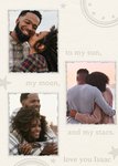Three torn paper effect frames traditional photo upload card featuring embossed stamp style circles, hearts and stars. "Love you Isaac" text is editable.