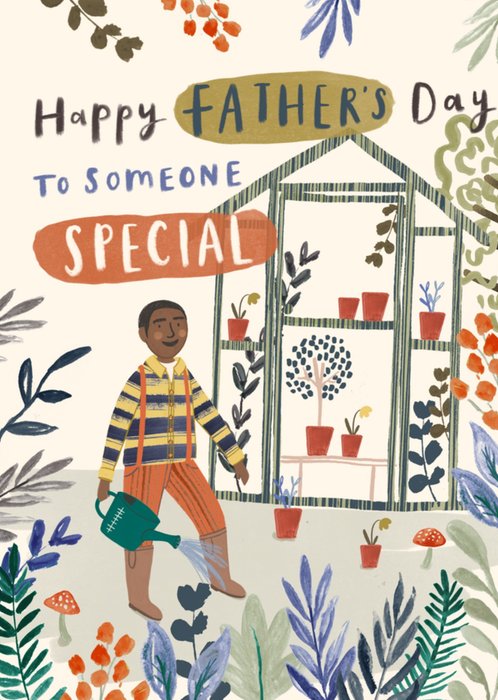 A warm and inclusive illustrated Father’s Day card featuring a person watering plants outside a greenhouse filled with cheerful potted greenery. Surrounded by soft, hand-painted foliage, this design is ideal for sending love to any special father figure. The neutral tone makes it suitable for a wide range of recipients.