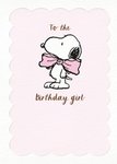 Front of card: Featuring an image of Snoopy standing proudly with a large pink bow around his neck on a scalloped pale pink & white textured background, with script text above & below. Text reads: "To the birthday girl."