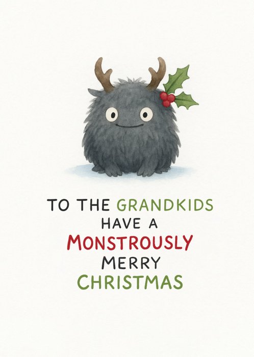 Featuring an illustration of a fluffy grey monster with antlers and a sprig of holly behind one ear, this playful design sits against a plain white background. The text is written in black, green, and red festive lettering below the monster.