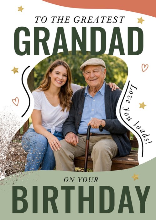 Featuring large green typography and a rounded central photo upload area, this greeting card for Grandad features a white and pale sage-green background decorated with stars, hearts, and black squiggle lines.