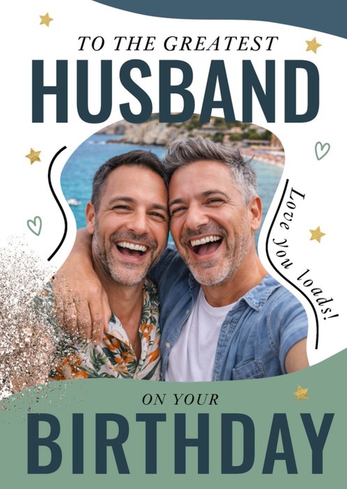 Featuring large blue typography, small gold stars, and abstract shapes on a light cream background, this greeting card includes a central oval photo upload area for a personalised birthday design.