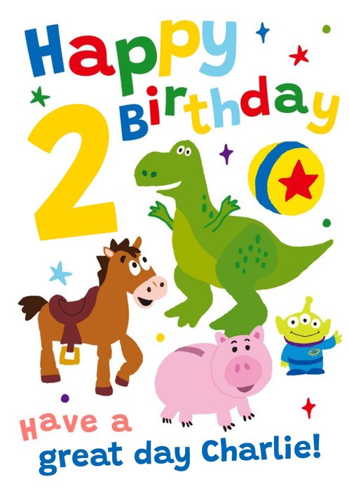 A fun, playful Toy Story design featuring Bullseye, Hamm, Rex and an Alien surrounded by colourful Happy Birthday lettering, with an editable name and number on a crisp white background scattered with stars and confetti.