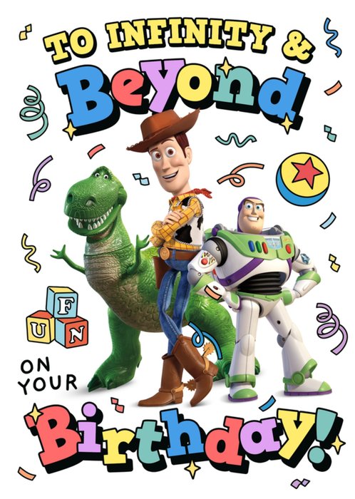 This bright and bold Toy Story greeting card features Woody, Buzz Lightyear and Rex surrounded by scattered confetti and bold typography on a white background.