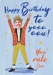 Featuring an illustration of a snazzy dressed guy with his hands in the air, he's wearing a vibrant orange blazer, stripped yellow trousers and a sparkly gold crown. There are stars in the background.