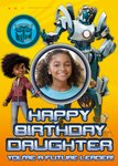 Front of card: Transformers Earthspark Photo Upload Birthday Card Featuring Morgan 'Mo' Malto and Thrash. Text reads: "Happy birthday daughter you're a future leader".