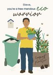 Illustration of a man holding a plant, surrounded by other garden items such as a compost planter, green waste wheelie bin and a bird box. For the green-fingered, environmentally conscious person in your life.