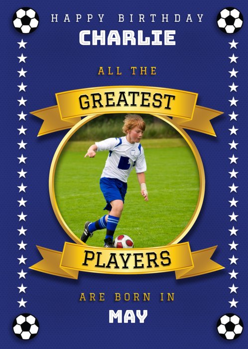 Happy birthday text is at the top of this card. Underneath is a trophy illustration that has an oval photo upload on it. At the base of the trophy there is a text editable engraving option that says 'Brother Of The Year'. There is a rosette with 7 attached to the trophy, this age is editable!