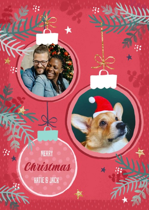 Two Bauble Photo Frames On A Red Background Photo Upload Christmas Card