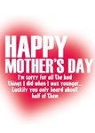 Front of card: Large typographic card with white text on a blurred heart. Text reads: "happy mothers day, im sorry for all the bad things i did when i was younger...luckily you only heard about half of them".
