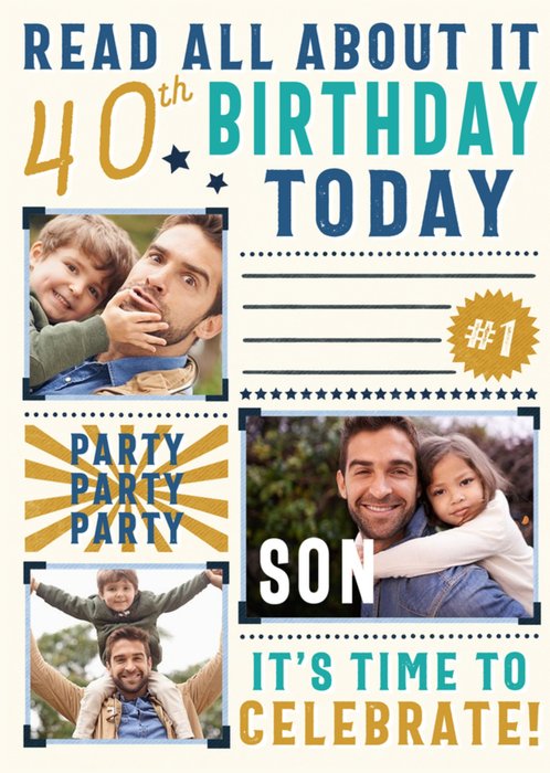 Typographic Read All About It Son 40th Birthday Multiple Photo Upload Card
