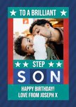 Front of card: Features a Bold colourful typographic text with a large photo upload with illustrations of white stars: "To a Brilliant Step Son Happy Birthday! Love From Joseph X". Text can be personalised!