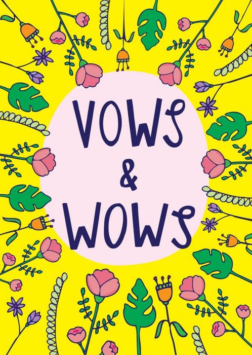 Typography Surrounded By Colourful Flowers On A Yellow Background Vows and Wows Wedding Card