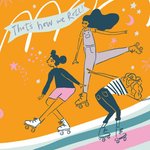 Featuring an illustrated group of friends roller skating with stars and a moon on an orange background.