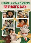 Front of card: Wallace And Gromit Photo Upload Father's Day Card Featuring Wallace enjoying cheese and crackers with five photo frames. Text reads: "Have a cracking Father's Day".