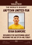 "Wanted the world's biggest Anytown United fan Ryan Dunmore required for questioning about reaching the age of 24-nil today!". 'Anytown United fan' and 'Ryan Dunmore' can be personalised!