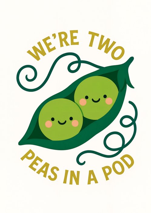 An illustrated greeting card featuring two smiling peas inside a dark green pea pod with curling vines, centred on a white background.
