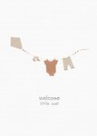 A greeting card with a minimalist clothesline illustration showing a kite, tiny socks, a onesie and trousers strung across the upper centre on a soft white textured background.