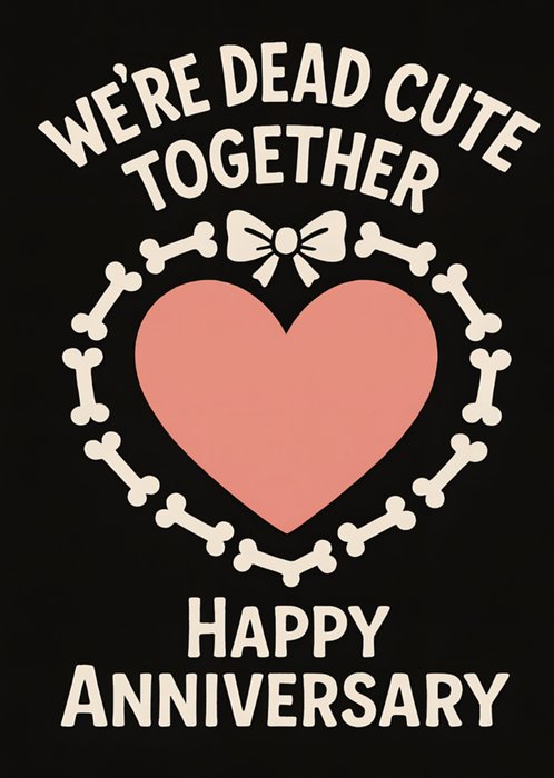 Featuring a playful heart framed by a ring of small bones with a bow above, this greeting card has a black background with simple cream and pink illustration.