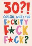 Bold multicoloured text in a playful font on a pale background with stars replacing some letters. The design uses humour and strong language to mark a milestone birthday.