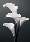 Featuring white calla lilies in a close-up photographic style on a dark grey background.