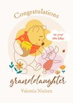 Features illustration of Winnie The Pooh holding Piglet's hand carrying a pot of honey. Text reads: "Congratulations On Your New Baby Granddaughter Valentia Nielsen". Name is customisable