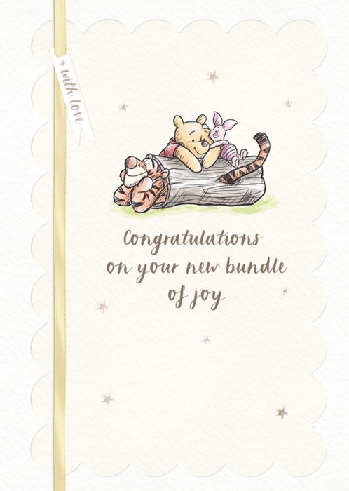 This Winnie the Pooh-themed greeting card features a soft sketch style illustration of Pooh, Piglet and Tigger resting on a log with tiny stars and a vertical ribbon detail, on a scalloped cream background.
